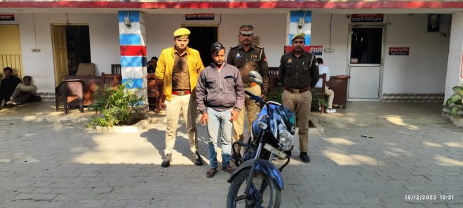 सुरेन्द्रपाल सिंह प्रभारी निरीक्षक कोतवाली तिलहर के नेतृत्व में चलाये जा रहे अभियान रोकथाम जुर्म जरायम ,अवैध शराब, चोरी , लूट , डकैती, गौ तस्कर , बरामदगी अवैध शस्त्र , मादक पदार्थ व वांछित अपराधी व वारन्टी की गिरफ्तारी के क्रम मे तिलहर पुलिस टीम द्वारा मोटर साईकिल चोर/अभियुक्त अवधेश कुमार उम्र करीब 28 वर्ष पुत्र श्रीपाल निवासी ग्राम नंगला जाहरना थाना पुवायां शाहजहांपुर (सम्बन्धित मु0अ0सं0 890/2023 धारा 379 भादवि) को मय एक अदद मोटर साइकिल न0 UP 27 AG 7774 TV स्टार स्पोर्ट (चेचिस न0 MD625PF57HIE29563 इंजन न0 NF5DH1829015) के साथ आज दिनांक 18.12.2023 को समय करीब 10.15 बजे अभियुक्त के घर ग्राम नंगला जाहरना से गिरफ्तार किया गया। उल्लेखनीय है कि इस्लाम पुत्र नन्हकू नि0ग्रा0 खनपुरा थाना तिलहर जनपद शाहजहाँपुर का पुत्र अकरम दिनांक 26.11.2023 को मोटर साईकिल नं0 UP 27 AG 7774 TV स्टार स्पोर्ट से ग्राम कोहनी में उर्स में गया था। जहाँ से उक्त मोटर साईकिल को अभियुक्त अवधेश कुमार पुत्र श्रीपाल उपरोक्त द्वारा चोरी करके अपने घर ले गया। जिसके सम्बन्ध में इस्लाम पुत्र नन्हूक उपरोक्त द्वारा थाना स्थानीय पर दिनांक 17.12.2023 को मु0अ0सं0 890/2023 धारा 379 भादवि बनाम अवधेश कुमार उम्र करीब 28 वर्ष पुत्र श्रीपाल निवासी ग्राम नंगला जाहरना थाना पुवायां शाहजहांपुर के पंजीकृत कराया गया। जिसके क्रम में मुकदमा उपरोक्त के अभियुक्त अवधेश उपरोक्त को गिरफ्तार किया गया तथा नियमानुसार विधिक कार्यवाही कर मा0 न्यायालय के समक्ष पेश किया जायेगा।