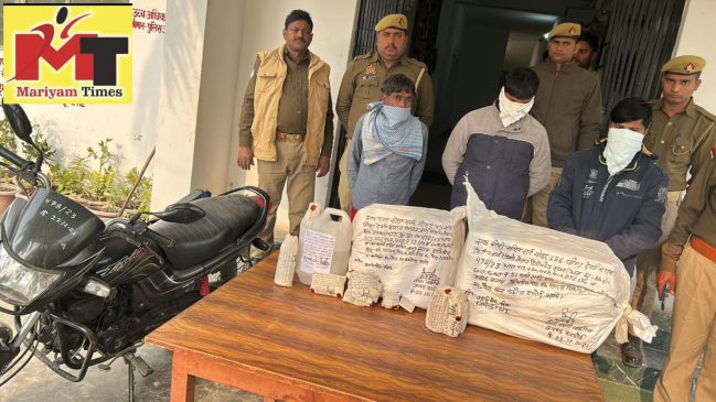 बतातें चलें शुक्रवार की सांय कॉल मुखबिर ने आबकारी निरीक्षक गिरीश कुमार को सूचना दी, कि एक व्यक्ति मोटरसाइकिल से नकली देशी शराब लेकर कछौना से सण्डीला की तरफ जाने वाला है, जल्दी किया जाए तो पकड़ा जा सकता है। इनको पकड़े जाने पर और अधिक मात्रा में नकली शराब पकड़ी जा सकती है। आबकारी निरीक्षक ने कछौना पुलिस को मुखबिर की सूचना से अवगत कराया, कछौना पुलिस टीम के उपनिरीक्षक अबरार हुसैन हेड कांस्टेबल सूरज कुमार व आबकारी निरीक्षक की संयुक्त टीम सुजानपुर मोड़ की पुलिया के पास मुखबिर सहित इन्तजार करने लगे, कुछ समय बाद कछौना की तरफ से एक बाइक आती दिखाई पड़ी। संयुक्त टीम ने बाइक सवार को रुकने का इशारा किया, पुलिस बल देखकर दोनो बाइक सवार व्यक्ति भागना चाहे, परन्तु संयुक्त टीम के ने घेर कर बाइक सवार चालक व दूसरे व्यक्ति को शुक्रवार सांय दबोच लिया। पकड़े गये व्यक्तियों ने अपना नाम अभिषेक सिंह उर्फ सत्यम सिंह स्व0 सर्वजीत सिंह निवासी ग्राम पैरा कोतवाली कछौना तथा दूसरे ने अपना नाम सर्वेश रैदास निवासी पैरा कोतवाली कछौना जिला हरदोई बताया, बाइक पर रखी बारी को चेक करने पर उसमें एक पेटी नकली शराब जिसपर विन्डीज ब्राण्ड रेडिको खेतान लिमिटेड लिखा। गत्तों में 45 पौवा 200एमएल नकली विन्डीज ब्राण्ड के प्लास्टिक की शीशी में बरामद किये गए, नकली देशी शराब के बारे में पकड़े गये अभिषेक सिंह उर्फ सत्यम सिंह ने पूछताछ में बताया नकली शराब धीरेन्द्र सिंह के पास से लेकर आ रहा हूँ, पकड़े गये व्यक्ति को लेकर संयुक्त टीम अभिषेक सिंह की निशानदेही पर धीरेन्द्र सिंह के गाँव निर्मलपुर की तरफ रवाना हुयी, गौसगंज सण्डीला मार्ग से निर्मलपुर मार्ग की तरफ जाते समय अभिषेक सिंह उर्फ सत्यम सिंह ने मोड पर खड़े एक व्यक्ति की तरफ इशारा किया यही धीरेन्द्र सिंह है, उसके साथ में जो बोरी है उसको लेकर कहीं जा रहा है। संयुक्त टीम ने इशारा किये गये व्यक्ति को घेर कर पकड़ लिया, पकड़े गये व्यक्ति ने पूछताछ में अपना नाम धीरेन्द्र सिंह पुत्र जगदीश सिंह निवासी निर्मलपुर कोतवाली कछौना जनपद हरदोई बताया। प्लास्टिक की बोरी की तलाशी लेने पर उसमें 130 पौवा नकली देशी शराब विन्डीज ब्राण्ड के प्लास्टिक की शीशी में मिले, बोरी में एक प्लास्टिक की पन्नी में 105 पीस नकली बार कोड, 55 पीस नकली ढक्कन व एक पिपिया में लगभग 4 लीटर एल्कोहल व एक मोटरसाइकिल नम्बर यू०पी० 30 एक्स 2438 बरामद किया गया, धीरेन्द्र सिंह ने पूछताछ में बताया उसको राहुल गुप्ता पुत्र अज्ञात निवासी कहली थाना कासिमपुर जिला हरदोई ने नकली शराब बनाने की समस्त सामग्री को दिया है, जो वर्तमान में लखनऊ में कहीं किराये के मकान में रहता हैं। उसके द्वारा ही यह नकली शराब बनाने की समस्त सामग्री उपलब्ध करायी जाती ह